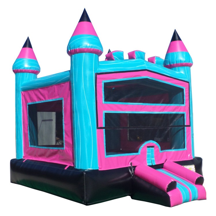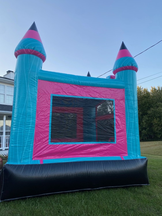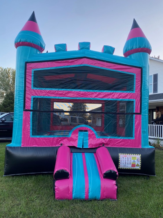 Bring the vibrant colors of South Florida to your back yard. The eye catching bounce house is a 13x13 in size, features bold pink, teal and black colors that instantly stand out at any event with a basketball goal inside.