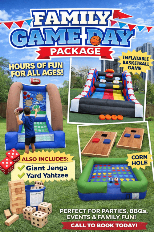 Bring the excitement of outdoor games to your next event with our Family Game Day Package! This action-packed setup features a variety of interactive games that are perfect for kids, teens, and adults. Guests can test their skills with the Inflatable Basketball Challenge, throw touchdowns in the Inflatable Football Toss, compete in friendly matches of Cornhole, and enjoy classic favorites like Giant Jenga and Yard Yahtzee.