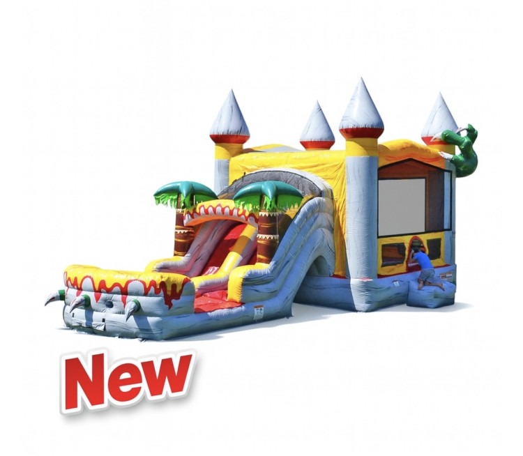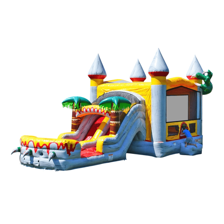 The T-Rex inflatable combo features vibrant colors and intricate details that will transport your guests back in time to the age of the dinosaurs. Riders can climb up into the bounce house and slide down into a soft landing area.